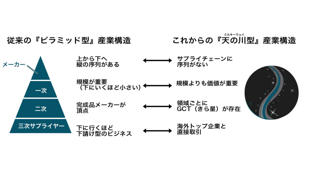 O2Pが提唱する「GCT(Global Core Top)企業」とは、規模や階層ではなく“価値”で勝負する製造業企業を指します。従来の製造業は、完成品メーカーを頂点としたピラミッド構造でしたが、これからは横に連なる星々=ミルキーウェイ型構造が必要です。
