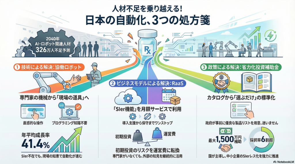 2040年、AI・ロボット関連人材が326万人不足する―この推計は、もはや人材の「育成」だけで解決できる領域を遥かに超えている。日本の自動化推進における最大のボトルネックは、現場の実情に合わせてシステムを構築する「ロボットシステムインテグレータ(SIer)」の慢性的な欠乏だ。ロボットがあっても、それを動かせる人がいない。この構造的欠陥「専門人材の壁」を突破する唯一の解は、希少なSIerの能力に依存しない、またはその役割を代替する現実的なソリューションを確立することにある。幸いにも、技術、ビジネスモデル、そして政策の三位一体が、その革命的な処方箋を提示し始めている。