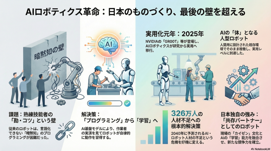 日本の進むべき道は明確である。短期的には前回の現実解で足元の「自動化格差」を解消しつつ、長期的にはAI基盤モデルの研究開発に注力する。そして何より、人材育成である。SIerからAIロボットを「教え導く」人材へ—役割は変わるが、現場の知を理解し、それをロボットに伝える人材は依然として不可欠だ。その育成こそが、326万人不足という危機を好機に変える道筋となる。