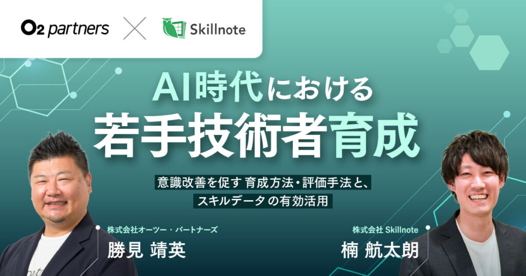 そこで、本セミナーでは、「実践型の技術者育成プログラム」を提供するオーツー・パートナーズ社と「スキルの可視化・仕組み化」を強みとするSkillnoteが共催し、主体性を引き出すコミュニケーション手法、成長を可視化する評価の仕組み、そして蓄積したスキルデータを戦略的に活用するスキルマネジメントシステムをご紹介します。